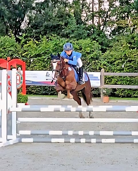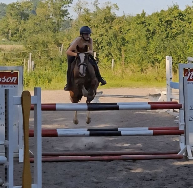 Princess Charlotte, also known as Greta, is a beautiful dark chestnut mare who has already competed in the German Championships in Eventing (CICOP-L**) and has been nominated by the national trainer for the Federal Young Talent Championship in Show Jumping over 1.30m. We bought Greta back then as a final size pony for my daughter and then leased her during the Corona period. She returned to us 9 months ago, and now we unfortunately have to part with her due to time constraints. She is always supportive of the rider and wants to please. She is a perfect teacher for Show Jumping and Cross Country. Extremely well-behaved with small children, scoring 8s even with them in the E style.