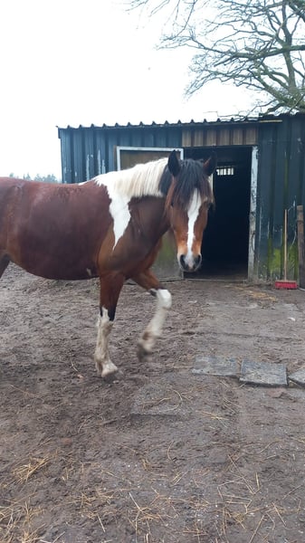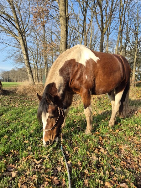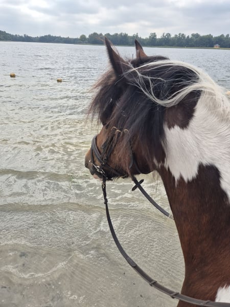 Met pijn in ons hart zoeken wij een nieuw huisje voor Bonnie. We kunnen haar helaas niet bieden wat ze nodig heeft en gunnen haar een gouden huisje. Bonnie (op paspoort Gaby) is een prachtige 8-jarige bonte merrie met een gouden hart voor degene die haar vertrouwen wint. Ze meet ongeveer 1.45 meter. Ze is een echte knuffelkont; tijdens de dagelijkse klusjes komt ze regelmatig vragen om kriebels en kusjes. Bij nieuwe mensen kan ze wat onzeker zijn, maar zodra de klik er is, heb je een maatje voor het leven. Bonnie geniet ontzettend van buitenritten. Op buitenrit voelt zij zich het prettigst en loopt ze ontspannen mee. In een groep of alleen (dit vindt ze in het begin nog wel spannend). In een groep is het belangrijk dat haar tempo goed bewaakt wordt; wanneer het haar te snel gaat of als ze onzeker wordt door omgevingsfactoren kan ze gespannen raken, wat zich kan uiten in bokken. In de bak rijden doet ze niet graag. Hiervan raakt ze gespannen waardoor ze gaat staken. Wellicht is dit met goede training eruit te rijden, wij hebben dit niet gedaan en lekker van haar genoten op buitenrit. Ondanks de vele buitenritjes loopt ze op blote voeten. Ze is braaf bij de smid. Bonnie heeft vorig jaar last gehad van stijve spieren, waarschijnlijk vanwege een niet goed passend zadel bij de vorige eigenaar. Hiervoor is ze door een fysiotherapeut behandeld. Ze heeft lasertherapie en acupunctuur gehad, wat haar verlichting gaf. Ze loopt nu sinds het voorjaar goed. Af en toe kan ze luchtzuigen, vooral op momenten rondom voer. Ze doet dit niet veel en ervaart hier geen medische gevolgen van. Bonnie vertoont merrie gedrag. Ze krijgt dagelijks CBD-druppels; deze druppels helpen haar hormonen balanceren waardoor ze nu minder fel reageert. Ze staat bij ons apart van de ruinen. Voor wie is Bonnie geschikt? Bonnie zoekt een ervaren, rustige, maar zelfverzekerde eigenaar die haar onzekerheden begrijpt en haar de tijd wil geven om vertrouwen op te bouwen. Ze functioneert het best in een stabiele omgeving, met duidelijke grenzen en een consequent maar vriendelijk iemand. Voor iemand die graag buitenritten maakt en op zoek is naar een paard met een liefdevol karakter, kan Bonnie een fantastisch maatje worden. Ze is recent geënt en ontwormd. Braaf op de trailer, loopt er zo op. Voor meer informatie, foto's en video's, stuur een privébericht. Prijs is voor een goed huisje bespreekbaar.