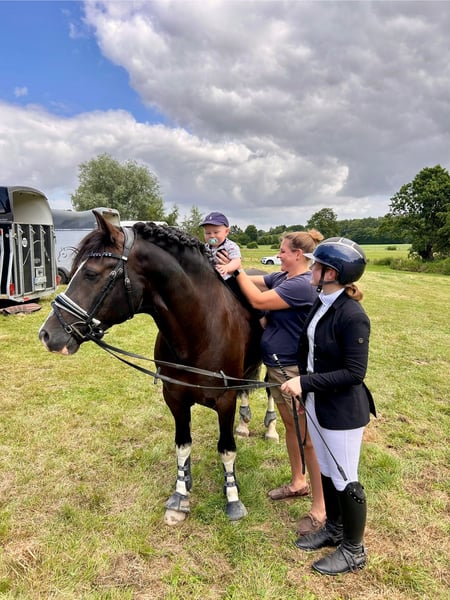 Möhlenbeeks Bandit is an 8-year-old approved Welsh Cob (Section D) stallion standing at 14.4 hh. He combines sporting potential, willingness to perform, and an exceptional character. Is there anything Bandit cannot do? Clearly not. Whether dressage, jumping, cross-country, or breeding – Bandit learns quickly, is always eager for new challenges, and strives to please his handler. Bandit impresses not only with his appearance but also with his wonderful, completely non-stallion-like temperament, a great work ethic, and clear, comfortable gaits. (He is also easy to handle and ride for children!) In jumping, he shows a powerful scope, is brave, and always wants to get to the other side – he is unimpressed by fillers and water ditches. He also demonstrates courage and reliability on cross-country, confidently galloping over built-up ditches and through water. Solo or in a group, hacking, bathing, riding bareback with just a halter and lead rope – all pose no problem for him. Bandit is stabled overnight and spends his days alone in his paddock. He is not bothered by other stallions, geldings, or mares, whether in the box or on the paddock. Additionally, he is loading and farrier-friendly, regularly wormed, and vaccinated. (Breeding) achievements: • Approved on 08.02.2020 in Neumünster • Completed the 30-day performance test (dressage focus) from August 8 to September 9, 2021 • Overall 5th place, 2nd place among Welsh ponies at the FN Federal Stallion Show for Sport Ponies in Berlin on January 20, 2023 In his first competition season, he achieved placings up to L level in dressage and successes up to A level in jumping. We also earned bronze in the district championships for Ostholstein in class 5 dressage and class 6 eventing. His potential in jumping extends beyond A level, and his lessons over L level are further solidified. Bandit confidently mastered his first cross-country course and was the first reserve. Price may increase with further training and achievements. It is very important to us that Bandit is not only supported and challenged in his sport but also loved in his new home and becomes your new best friend. Bandit is sold on behalf of his owner. He is still owned by his breeder and has been entrusted to me for his training. For serious inquiries, we look forward to your message or call – videos and further information are available upon request.