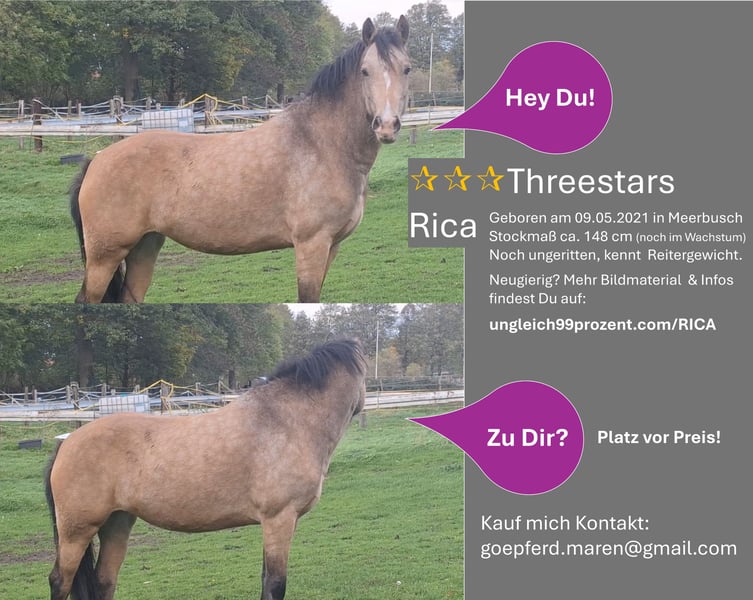 Hallo, ich bin Rica, am 09.05.2021 in Meerbusch geboren. Suche mein perfect Match, für die weitere Ausbildung. Am besten Jemanden mit Jungpferde Erfahrung und Offenstall. Bin neugierig, kreativ und lerne schnell. Innerhalb der Freiarbeit begeistere ich mit akkurater Ausführung und wurde bereits schonend auf einen Reiter im Rücken vorbereitet. Neugierig? Mehr Infos und Bildmaterial findest Du auf ungleich99prozent.com/RICA Platz vor Preis!