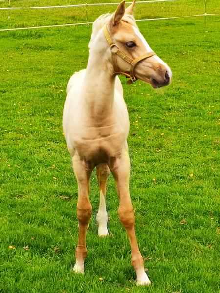 Sweet and affectionate foal with three good gaits. Loves attention and grooming. Is handled daily and walks nicely on a lead rope. Also accustomed to having its hooves picked out daily. Older full siblings are nice, reliable, and well-mannered all-rounders, who move well, learn quickly, and enjoy working together. In short, the ideal pony for a slightly older child, teenager, but also for a young adult.