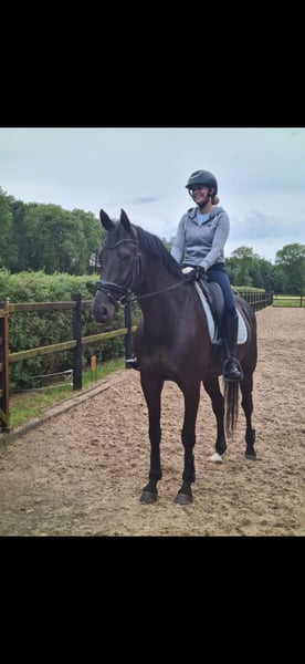Almost Black is een brave en werkwillige dressuurruin van 2015, 1m67, makkelijk in de omgang en bij het rijden, hij heeft veel wedstrijdervaring, is makkelijk te laden en braaf op vervoer, bij de smid en dierenarts. Hij kent de zijgangen (wijken, schouderbinnenwaarts, appuyementen, travers), contragalop, enkelvoudige galopwissels en een groene vliegende galopwissel. Afstamming: All al Once (v. Ampere) x Kostolany In december 2022 klinisch en rx-goedgekeurd (incl. rug en nek). Overkeuren kosten koper. Reden van verkoop: tijdsgebrek van de eigenares.