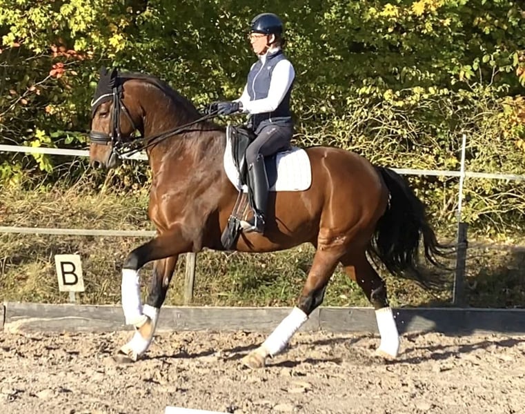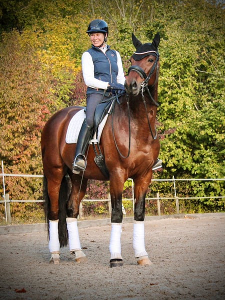 Vielseitiger Wallach mit Dressurschwerpunkt und top Gelände- und Springqualitäten Dieser charmante Wallach überzeugt durch solide dressurmäßige Ausbildung und Freude an abwechslungsreicher Arbeit. Stangen- und Cavalettiarbeit sowie kleine Sprünge machen ihm sehr viel Spaß; im Springen wurde er jedoch nicht weiter gefördert. Im Gelände zeigt er sich trittsicher und entspannt – ideal für gemütliche Ausritte, aber auch jederzeit bereit für einen flotten Galopp zu haben. Er kennt Arbeit an der Hand und wurde ursprünglich für den Westfälischen Zuchtverband als doppelveranlagter Hengst gekört. Aufgrund seiner Vorerfahrungen ist er kein Männerpferd und kein Turnierpferd – er benötigt einen feinfühligen, erfahrenen Reiter, der seine Qualitäten zu schätzen weiß. Perfekt geeignet für ambitionierte Freizeitreiter, die ein vielseitiges, leichtrittiges und sensibel reagierendes Pferd suchen und gerne abwechslungsreich arbeiten. Hinweis zur Haltung: Der Wallach ist Sommer wie Winter täglichen Koppelgang gewohnt. Diese Form der Haltung wünschen wir uns auch weiterhin für ihn, da sie ihm sehr guttut. Video auf Anfrage