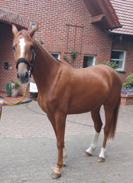 For sale is a young chestnut gelding directly from the breeder. Faludi is still at the very beginning of his training. He impresses with his gentle temperament and his charming, balanced nature. The young gelding already shows a lot of talent and eagerness to learn. Faludi comes from an internationally successful dam line with placings up to advanced levels in dressage and show jumping. He is ideally suited for dressage and is ready to develop further together with his new owner.