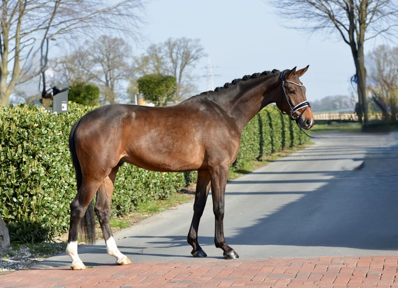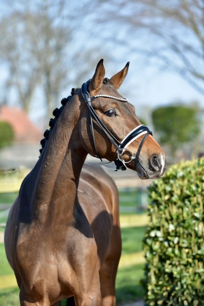 A truly charming four-year-old with an almost unbeatable walk and excellent temperament – this is "Easy," as Every Time is affectionately called. Anyone looking for a genuine gem in the stable will find him to be just that – he impresses with his charm, outstanding character, always friendly and human-oriented, focused under saddle, and always on the rider’s side – exactly as one would wish! Easy comes directly from the breeder, was carefully backed, had a rest during his three-year-old year in the summer, and has been under saddle for several months now. In handling, he is a real sweetheart, demonstrating natural rideability, a superb walk, a beautiful canter, and elastic trot work. His sire, Ellis, descends from the Grand Prix sire Escolar and was himself a three-time finalist at the Bundeschampionate and HLP winner with a score of 9.09 in dressage at the 14-day test in Adelheidsdorf and 9.12 in the sport test in Münster. He has produced licensed stallions and successful sport horses. Ellis is full brother to Espe, who won multiple medals at the European Championships for Juniors and Young Riders and is the dam of the successful Esquire. The dam’s sire, Sir Donnerhall, brings sportily successful elegance into the pedigree. Easy’s dam also produced the licensed son of Le Formidable, Lorenzi, as well as numerous sport-successful offspring. The dam line includes, among others, Davi G, who competed up to Inter II, Hollister/Inter I, Love to Fly/CCI3*, and many more. Current X-ray test available.