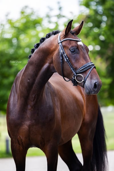 Dieser 4-jährige Wallach überzeugt mit einem außergewöhnlich ruhigen Charakter und hervorragender Qualität für die Zukunft. Er verfügt bereits über Turniererfahrung und konnte sich beim Landeschampionat Westfalen 2024 für 3-jährige Hengste im Finale den 3. Platz sichern. Er ist super brav, absolut unkompliziert und eignet sich sowohl für Profis als auch für Amateurreiter. Mit seinen sehr guten Grundgangarten, seiner Rittigkeit und seinem klaren Kopf sehen wir in ihm großes Potenzial für den Grand Prix-Sport in der Zukunft. Der Wallach besitzt einwandfreie Röntgenbilder. Wir beantworten Ihnen gerne weitere Fragen und freuen uns über Ihr Interesse.