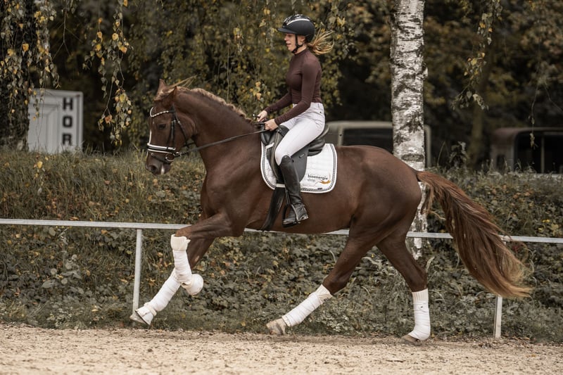 Zum Verkauf steht ein besonders typvoller und ausdrucksstarker Westfalen-Wallach von Baccardis Best x Fürst Romancier in der tollen Farbe Dunkelfuchs. Geboren 2022 ist er nun 3,5 Jahre alt und ist bereits 1,70 groß Mokka überzeugt mit drei überragenden Grundgangarten, die keine Wünsche offenlassen: ein kraftvoller, schwungvoller Trab, ein bergauf Galopp sowie ein raumgreifender Schritt. Seine natürliche Bewegungsqualität und sein Talent lassen bereits jetzt erkennen, dass ihn eine große Zukunft im Dressursport erwartet. Mokka springt bereits fliegende Wechsel auf beiden Seiten, was seine hervorragende Balance und Lernbereitschaft unterstreicht. Er ist seit Mitte des Jahres schonend angeritten und ging bereits zwei Reitpferdeprüfungen, in denen er sich sehr souverän und gelassen präsentierte mit Noten über 7 Zur Abwechslung springt er auch mal kleine Kreuzchen und nimmt regelmäßig an einer wöchentlichen Cavaletti-Stunde teil, was er mit viel Freude und Übersicht meistert. Er ist wirklich für jeden Spaß zu haben und macht alles mit, was man ihm anbietet. Im Umgang und unter dem Sattel zeigt er sich mit einem Traumcharakter – eine echte 10 von 10! Er ist im Kopf schon wie 20: immer cool, verlässlich und absolut nervenstark. Egal ob 10 andere Pferde in der Halle sind, Reklame flattert oder das bunte Vierecker bleibt er stets gelassen und bei seinem Reiter. Auch beim Ausreiten, Verladen oder auf Turnieren ist er einfach brav und unkompliziert. Trotz seines Alters muss er vor dem reiten nicht ablongiert werden und hat unter dem Reiter noch nie einen falschen Tritt gemacht. Ein junger Wallach mit bestem Interieur, großem Herz und überdurchschnittlicher Bewegungsqualität – ein Pferd, das jeden Tag Freude macht und auf eine vielversprechende Zukunft im Dressursport hoffen lässt. Röntgenbilder inkl Hals und Rücken liegen ohne Befund vor. Er wird nur in die besten Hände verkauft. Da wir kein Reit-Tourismus unterstützen werden für das Probereiten 30€ berechnet.