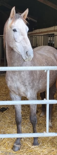 Due to capacity reasons, we are offering a well-started 5-year-old gray gelding by Cornet du Lys out of a Casall mare. He was backed later in his training and therefore has no competition experience yet. He is well-behaved and eager to work. He is sensitive and not suitable for beginners. He is familiar with turnout, paddock, lunging, etc. Unfortunately, two of our riders will be unavailable for an extended period, so we are offering this promising show jumping horse at a very favorable price.