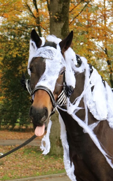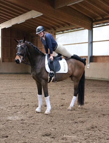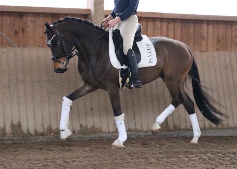FLASH MICH - Franziskus x Fürst Frederick x Roboter. Zijn naam is programmaties. Eigenlijk wilden we dit droompaard behouden, maar door de tijdsinvestering van onze klantenpaarden kunnen we hem helaas niet de aandacht geven die hij verdient. Daarom zoeken we nu, met pijn in ons hart, een ultiem goede plek voor hem. Deze zelfgefokte 5-jarige ruin heeft alles in zich dat dressuurliefhebbers hart sneller doet kloppen. Het karakter is een 12/10, met drie keer meer dan gemiddelde basisgangen, gecombineerd met een ongelooflijke lichtvoetigheid en een prachtig, bijna schilderachtig uiterlijk. Als veulen heeft hij al al onze verwachtingen overtroffen, werd hij kampioensveulen en kreeg hij de gouden veulencertificering van het Westfaalse paardenstamboek. Flash zou twee jaar geleden op de merriekampioensverklaring worden gepresenteerd, maar helaas gooide een röntgenonderzoek roet in het eten omdat hij een chip in zijn knie heeft. Deze is operabel en veroorzaakt klinisch geen problemen. Desalniettemin willen we hem vanwege deze diagnose onder de waarde verkopen, in een liefdevol en passend thuis. Flash is ook het ideale paard voor pony-omzetters of herintreders. Hij is absoluut mentaal klaar, vergevingsgezind voor fouten, doet alles mee en wil altijd gefallen. Iedereen die hem tot nu toe heeft gereden, was overtuigd van hem. Een jonge paard dat gewoon plezier geeft.