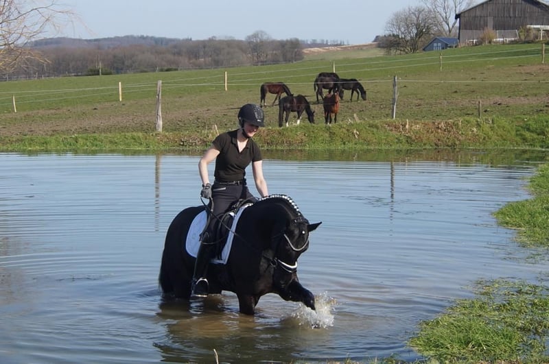 Fiorello ist ein äußerst hübscher Sympatikus, der eine Rittigkeit und Arbeitsbereitschaft an den Tag legt, die äußerst selten sind. Er vereint das liebe Wesen und die gute Anlehnung von dem Füstenballsohn Finest mit dem Mut und Leistungswillen von Arpeggio. In dritter Generation folgt die Hengstmutter Danny Doreen, die ihresseits bereits mit Let de Lember einen gekörten Sohn stellte. Sie sorgt hier für die tiefe Winklung im Hinterbein, die für eine gute Balance und Kraftentwicklung notwendig sind. Seine drei Grundgangarten sind gleichermaßen gut verteilt. Der Schritt ist sehr ergiebig mit sicherem Übertritt. Im Trab hat er ein gutes Hinterbein mit sehr viel Lastaufnahme und viel Schulterfreiheit. Hier hat er den Vorteil, dass er sich durch seinen sehr guten Körperbau leicht wieder schließen lässt. Für weniger erfahrene Reiter ist dies sehr hilfreich. Ähnlich ist es im Galopp. Er verfügt über eine sehr gute Bergaufgaloppade, wartet dabei aber auch stets auf den Reiter. Grundsätzlich kann man Fiorello jedem ans Herz legen. Soweit sich jemand für ein relativ junges Pferd entscheiden will, ist er genau der Richtige. Bei ihm muss man nicht immer Alles sofort richtig machen, sondern erhält viele Gelegenheiten und stets gute Laune geschenkt. Ein Tüv ohne Befund liegt aus Februar 2026 vor.