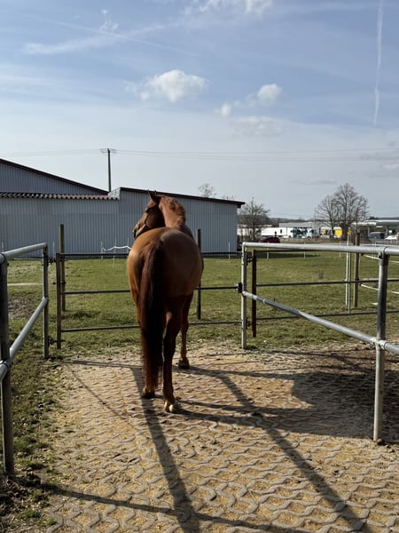 Valdancio is a modern-built chestnut gelding. Turning six this year, he has all doors open to him. He is characterized by very good rideability once he has won his rider’s heart. Initially, he may test boundaries due to his age, but his playful ideas often bring a smile. Besides dressage work (his canter is particularly impressive), he is also familiar with free jumping, groundwork, trail riding, and hacks. I am looking for an ambitious rider who can become his number one. Accessories can be included upon request.