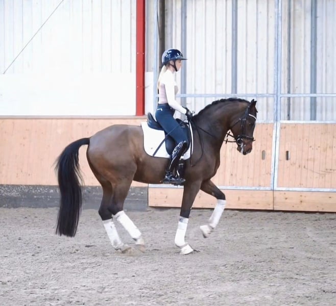 Flacon is a stunning son of For Romance. He was licensed in 2022/23 at the Westphalian Stallion Licensing and now leads an active life as a gelding. Under saddle, he impresses with his quality, rideability, and a very positive attitude towards work. Currently, he comfortably performs at Medium level in dressage and is being gently introduced to S-level movements. A very typey, expressive gelding who leaves no wishes unfulfilled. In daily handling and within the herd, he is absolutely well-behaved, uncomplicated, and reliable. No emails, only phone calls. Price plus VAT. Information without guarantee.