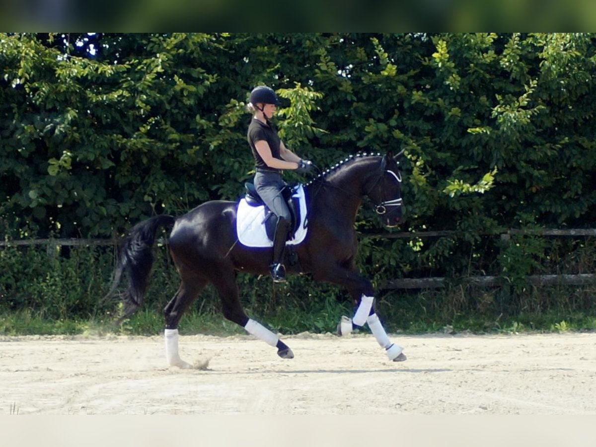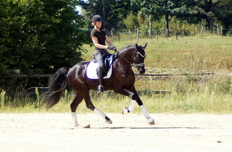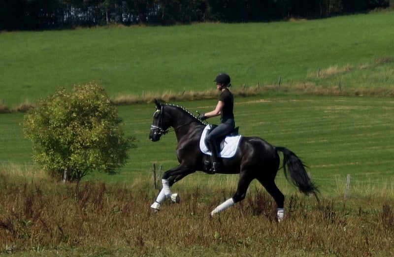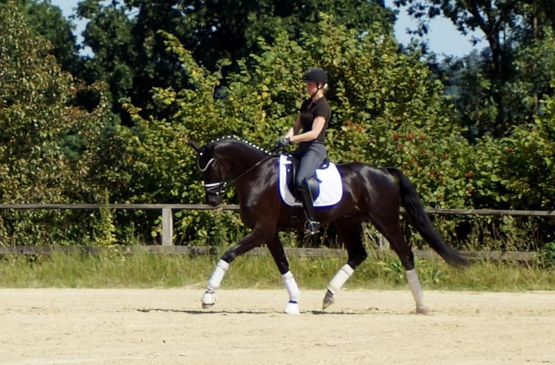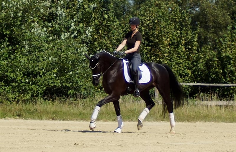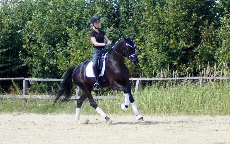 Fiorino is a top-class dressage horse that enjoys what humans offer him. Equipped with exceptional basic gaits, this strikingly beautiful gelding draws many eyes. His walk is large and very efficient. In the trot, he has a good hind leg that translates into expression and mechanics with plenty of shoulder freedom. His canter is maximally constructed uphill and gains significant importance from the enormous shoulder freedom. Personally, he is completely indifferent to this. He is only surprised by the many spectators, as he enjoys it when the rider fiddles with him, new tasks arise, or he simply gets to experience something. His riding reflects much of the Fürstenball bloodline. The way he moves softly and dynamically with a very pleasant contact can be attributed to his sire, Finest (by Fürstenball). Through the maternal line, which is also known for its jumping performance, he inherits a good physique with strong hind legs and a willingness to perform. Overall, one would today describe him as an expressive, extremely likeable "triple gaited" horse (three good basic gaits), whose future looks very promising due to a successful genetic foundation. A good TÜV from May 2025 is available.