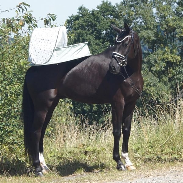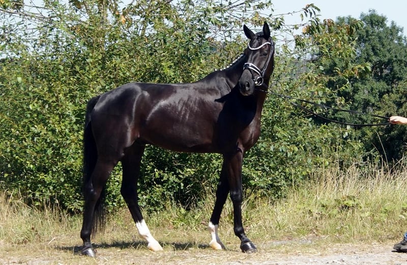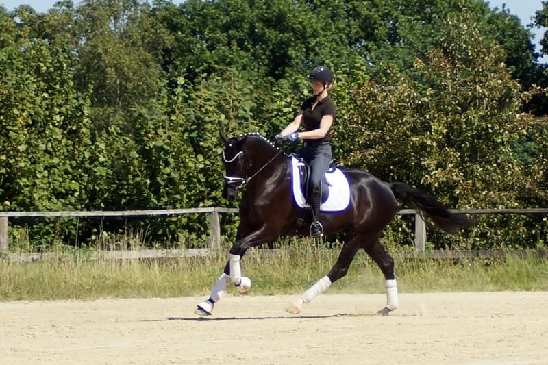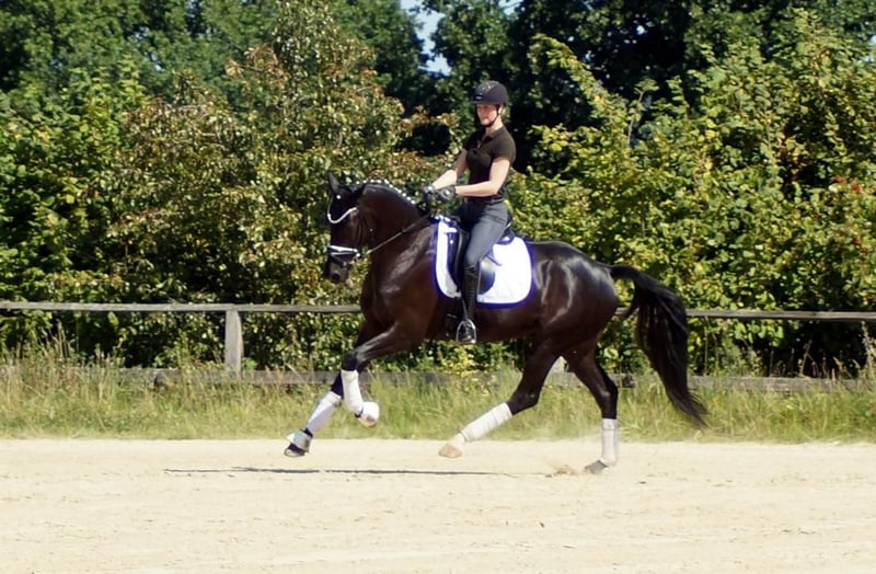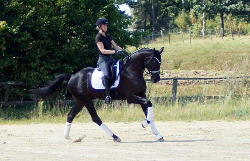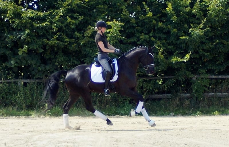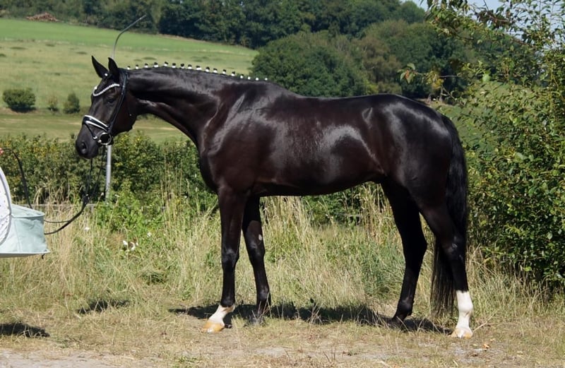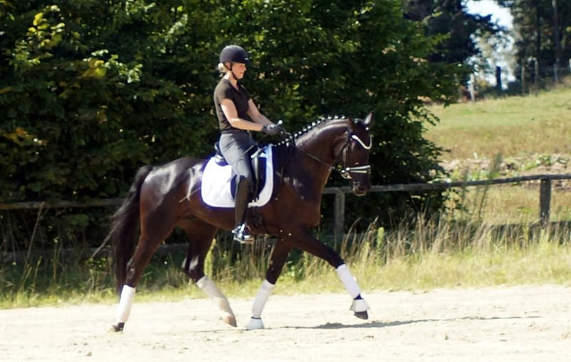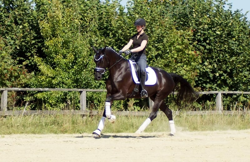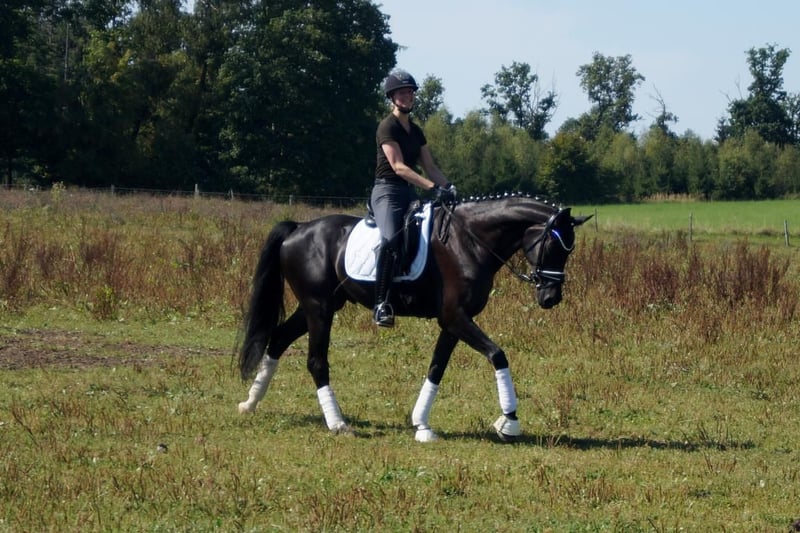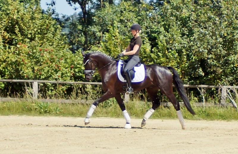 Fiorino è un cavallo da dressage di prima classe, che si diverte con ciò che l'uomo gli offre. Dotato di andature di base eccezionali, questo bellissimo castrato attira molti sguardi. Il passo è ampio e molto produttivo. Nel trotto, dispone di un buon posteriore, che si traduce in espressione e meccanica con molta libertà di spalla. Il salto di galoppo è costruito in modo massimo in salita e acquista grande importanza grazie all'enorme libertà di spalla. A lui questo non importa affatto. Si sorprende solo per il gran numero di spettatori, perché gli fa piacere quando il cavaliere si occupa di lui, quando arrivano nuovi compiti o semplicemente quando può vivere nuove esperienze. A livello equestre, si riflette molto del sangue di Fürstenball. Il modo di muoversi in modo morbido e dinamico con una connessione molto piacevole lo attribuiamo al padre Finest (da Fürstenball). Attraverso la linea materna, nota anche per le sue prestazioni nel salto, riceve una buona corporatura con buoni posteriori e una grande disponibilità al lavoro. In generale, oggi si parlerebbe di un "tre andature" espressivo e molto simpatico (tre buone andature di base), il cui futuro si presenta molto promettente grazie a una solida sicurezza genetica. È disponibile un buon TÜV di maggio 2025.