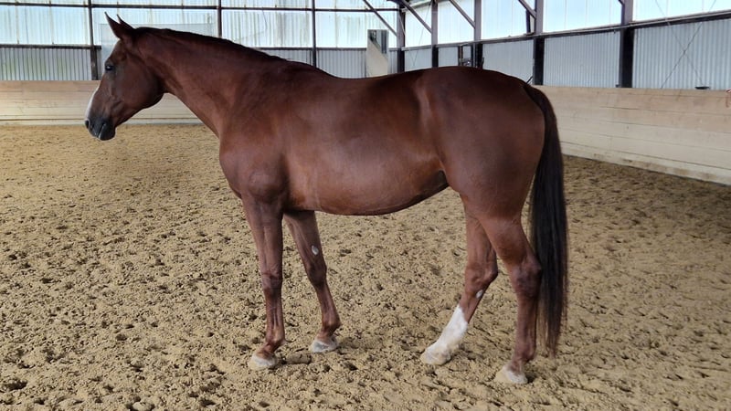 I am offering my mare by Destano x Fanastico x Watzmann (born in 2015, approximately 17.2 hh). In 2023, she foaled a colt and was immediately pregnant again through natural cover after not conceiving following a stillbirth with her previous owner. She has been ridden generally, but due to a motor impairment, her movement is unbalanced. X-rays from the clinic in Telgte, which examined her jaw and cervical vertebrae, showed no abnormalities. The veterinarian suspects that her issues resulted from external influences (e.g., a pasture accident) and sees no obstacle to her continued use as a broodmare. Currently, she is ridden with a combined bit and sidepull, with varying success. One to two rides per week are generally no problem, but I do not want to sell her as a purely leisure horse. She is not a "problem horse," but rather has a physical limitation that can be well compensated through targeted groundwork. She enjoys this very much, and further training in this area could benefit her. Overall, she is a very people-oriented animal. I am only offering her because I will keep her offspring and unfortunately lack the time to devote to her. She could also serve as a companion for another horse, as she gets along well with others and shows no social difficulties. Videos of her lunging and riding can be sent via WhatsApp or Telegram. Priority over price! This is not an emergency sale. I wish for her to find a loving home—preferably with breeders or experienced horse owners. For a 5-star home, the price is not the main concern.
