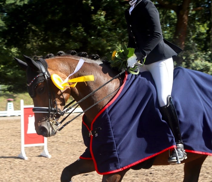 Yegua de 16 años con sólida formación busca nuevo hogar Está a la venta nuestra yegua de 16 años con una formación atractiva y experiencia en el cuadrilátero de doma. Nuestra "Jolie" ha sido presentada en competiciones hasta la categoría "M" con éxito y actualmente se mueve en un nivel sólido de M/S. Recientemente ha ganado la Copa de Hamburgo U25 de doma en Hamburgo-Bergstedt. Dispone de 3 capacidades de movimiento por encima de la media, con mucho impulso y regularidad en el ritmo. La yegua es muy tranquila en el manejo, sociable y cariñosa. Es confiable y equilibrada tanto en el campo como en el trabajo con barras. También disfruta del trabajo de salto y de la colaboración con su jinete. Ha sido colocada en competiciones hasta saltos de A**. En cuanto a su actitud hacia el trabajo, siempre está motivada y dispuesta a avanzar. Es especialmente adecuada para la transición de un pony a un caballo de gran tamaño. Desde el punto de vista de la salud, está en perfecto estado, nunca ha estado gravemente enferma ni coja. Se puede realizar un examen veterinario actual si está interesado. Si está interesado y tiene más preguntas, no dude en contactarnos.