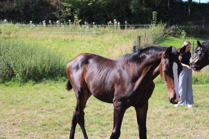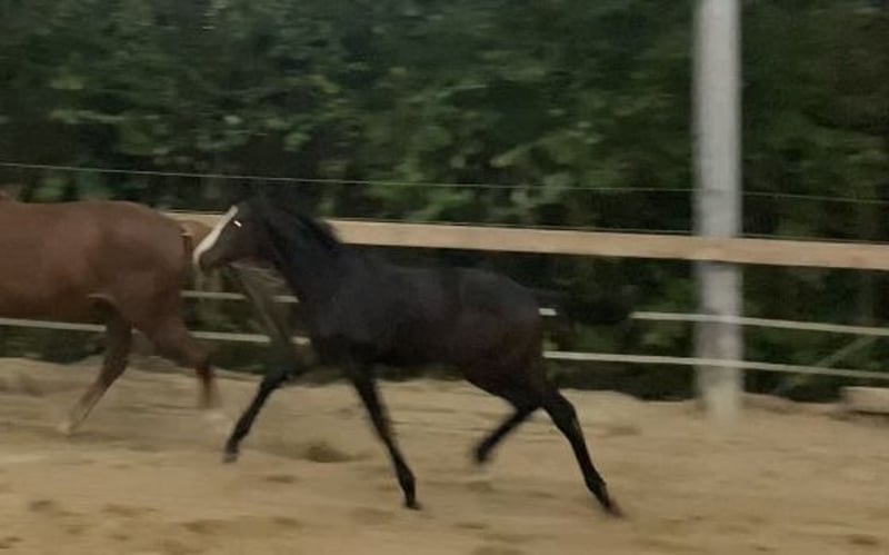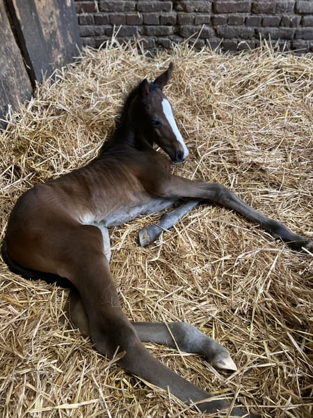 Daytona MT ist ein bewegungsstarkes und langbeiniges Stutfohlen von dem Warendorfer Landbeschäler Diamantenglanz aus einer De Beers Diamond (v. De Niro) x Hotline Stute. Sie überzeugt durch ihre sehr guten Grundgangarten, insbesondere mit ihrem bergauf angelegten Galopp und ihrem raumgreifenden Schritt, dem durch den ganzen Körper schwingenden Trab, sowie ihrem aktiven Hinterbein. Daytona ist am 15.04.2025 geboren und wächst in einem familiären Umfeld auf, sodass sie das Fohlen-ABC bei uns bereits gelernt hat. Sie ist stets dem Menschen zugewandt, unheimlich cool und ruht in sich selbst. Hier wächst ein tolles Juwel für den gehobenen Dressursport, den Freizeitsport oder auch für die Zucht heran. Ihre Mutter haben wir damals auch auf A* Niveau gesprungen und dort zeigte sie sich nicht untalentiert. Ihre Eltern lassen auf eine extreme Rittigkeit und Versammlungsbereitschaft hoffen. Die Aufzucht ist vor Ort möglich.