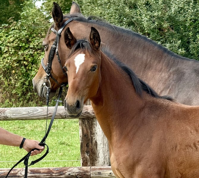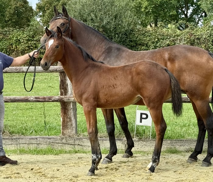Dieses Stutfohlen überzeugt durch seine elegante Erscheinung und sein ausgeglichenes Wesen. Es zeigt bereits vielversprechende Ansätze für den gehobenen Dressursport. Vater ist der hochfrequentierte DIAMANTENGLANZ , der durch Höchstnoten in seinen Hengstleistungsprüfungen und im Turniersport überzeugte.