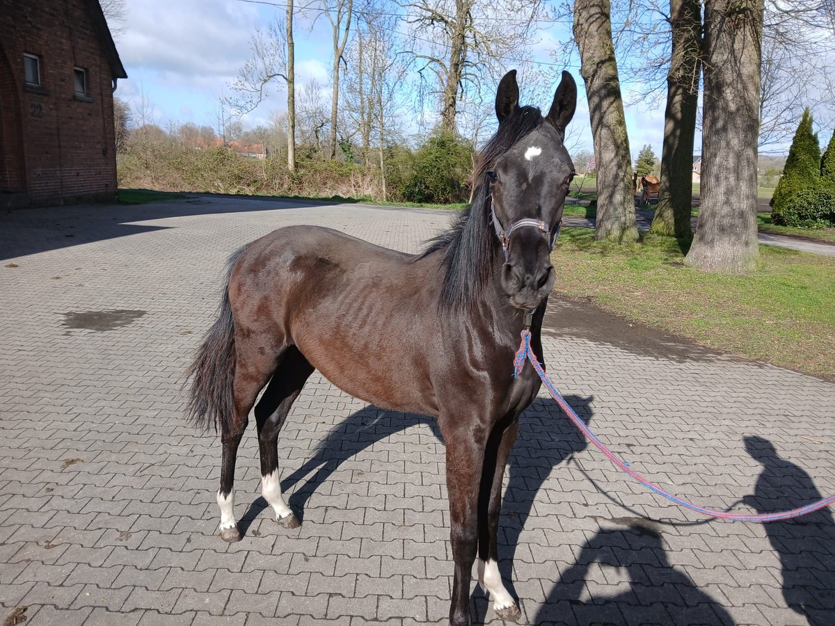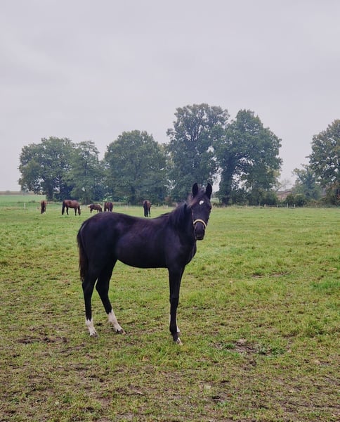 Wir verkaufen hier eine sehr liebe und gut geprägte sehr schöne Rappstute mit einem schönen Stern vor der Stirn. Woulez Vous geht brav am strick mit,ist total verschmust,und ist ein totaler Menschenfähn. Sie hat sehr lockere und schöne Bewegungen,die uns so manches mal den Ahtem verschlagen lässt,da es so schön aussieht wenn sie daher trabt.wer sich ein tolles Pferd heranwachsen lassen möchte,und für sich prägen möchte,Der hat hier einen richtigen Goldschatz gefunden.kommen sie gerne bei uns vorbei,ich stelle ihnen gerne Voulez Vous vor,sie freut sich immer wenn jemand kommt. Mit freundlichen Grüßen Rita Bruns