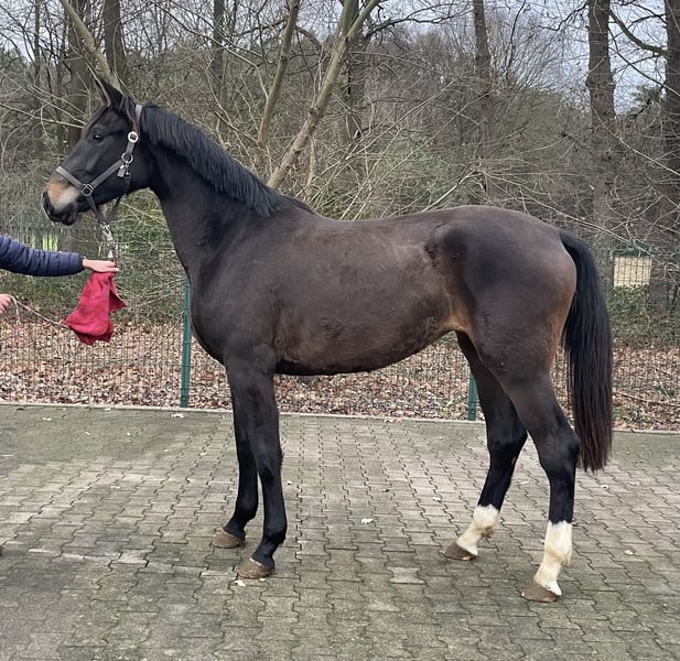 Wunderschöne bald 3-jährige dunkelbraune Stute mit einer tollen Abstammung Escolar x Fidertanz. 1,68m groß, sie ist vor kurzem von der Sommerweide in Stall reingeholt worden mit unseren anderen jungen Pferde. Dennoch ist sie schon super brav und umgänglich. Mit drei sehr guten GGA ausgestattet.