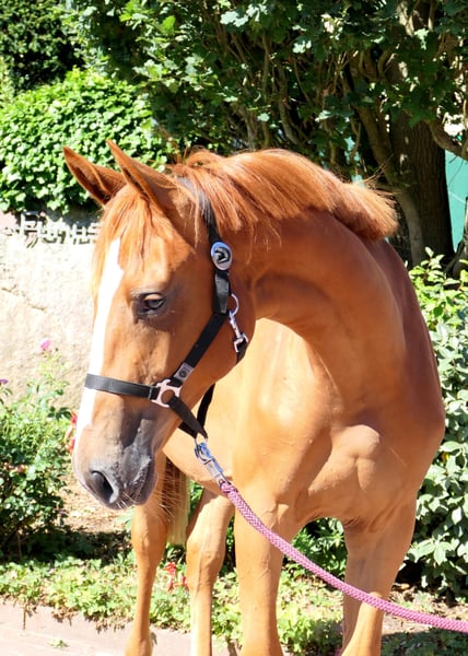 Se vende una talentosa yegua Westfalia, nacida en el año 2024. Esta elegante yegua alazán ya mide 165 cm, lo que la hace bastante grande. Posee un exterior correcto y una base estable, así como tres buenos aires básicos. Línea de sangre: Esplendido x Quaterback No solo destaca por su color llamativo, sino también por su carácter amigable y su disposición para aprender. Ideal para jinetes ambiciosos que buscan un caballo prometedor para todas las disciplinas de la equitación. Su padre fue reserva en su aprobación, y la madre está estrechamente relacionada con muchos caballos de deporte exitosos. Ambos también pueden ser vistos en el lugar. La yegua está bien educada, es tranquila en el manejo, con el herrador y al cargar. Está en un grupo 24/7 en el prado y se deja manejar con tranquilidad incluso allí. Puede quedarse en su grupo hasta el otoño. Si está interesado o necesita más información, no dude en ponerse en contacto conmigo. Visítenos y convénzase usted mismo de esta maravillosa yegua.