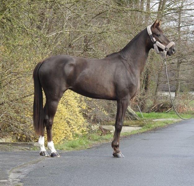 ❗️Due to the high volume of inquiries, we kindly ask that all questions be made by phone only.❗️ For sale is a 3-year-old dark chestnut mare with an approximate height of 16.1 hh. The mare has a very gentle and exemplary character and comes from excellent breeding. She has already been lightly lunged and is familiar with saddle and bridle. No further training has been requested or expected at this age. Due to limited training capacity, a decision has been made to sell her. She was raised in a mixed herd and is very socially compatible. We will not send videos of our horses without prior phone contact, so please refrain from requests such as "please send video." Viewings are possible at any time. For further questions, please feel free to call us at 0171 530 33 40. All rights to the images belong to Sport- und Freizeitpferde Wilfried Oestersandforth. Distribution or publication is strictly prohibited.