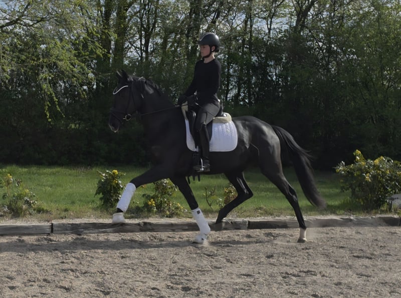 Diese wunderschöne, elegante Rappstute beeindruckt durch ihr harmonisches Erscheinungsbild und ihre vielversprechenden Grundqualitäten. Mit einem Stockmaß von 166 cm bietet sie die ideale Größe für den Dressursport und zeigt bereits jetzt eine ausgeprägte Lernbereitschaft sowie eine angenehme Grundhaltung. Noch nicht lange unter dem Sattel weist diese Stute trotzdem schon eine hohe Rittigkeit und dabei ein tolles Interieur auf. Auch für den jungpferdeerfahrenen Amateur geeignet. Ein guter TÜV liegt vor.