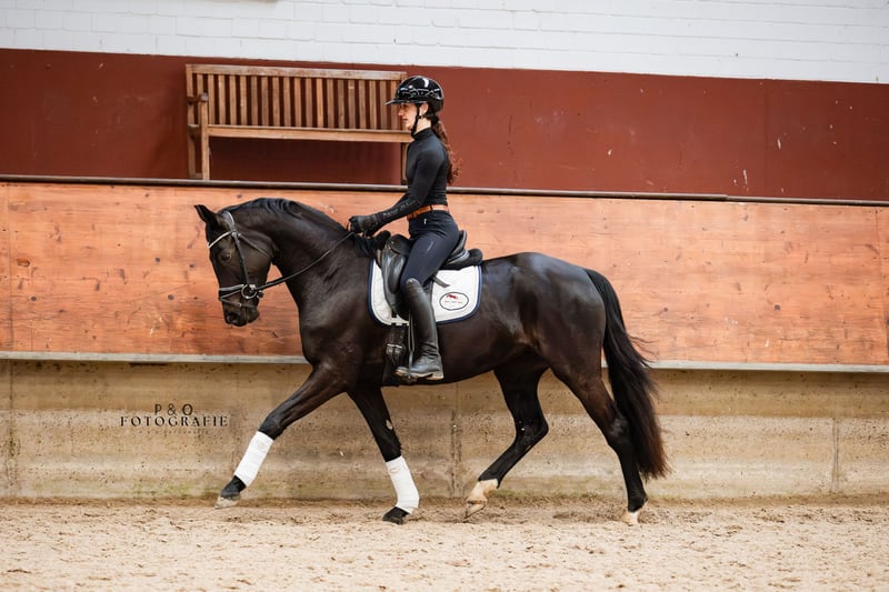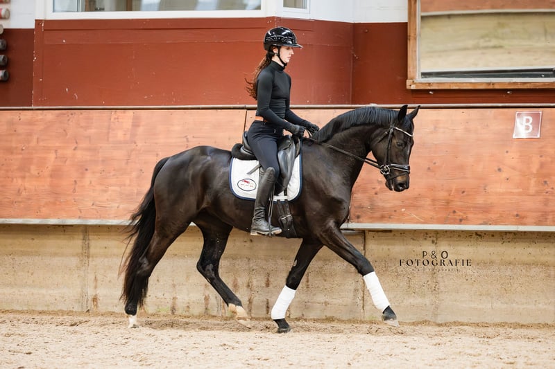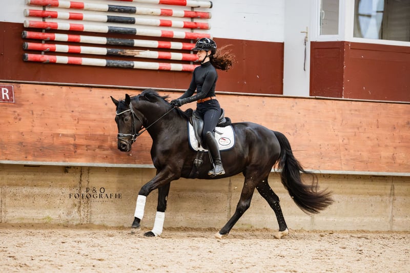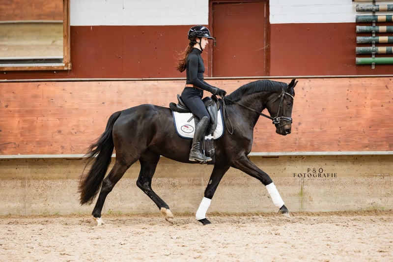 So Perfect, true to her name! A stunning jet-black dressage diva with excellent rideability! So Perfect is a very talented, well-ridden, and movement-rich young horse. She is friendly, approachable, easy to ride, well-behaved, and has very good gaits. With So Perfect, you will acquire a high-quality, absolutely light-footed young dressage prospect with great potential for the sport. Since So Perfect has only been under saddle for a few months and is quite sensitive, she is currently not suitable for beginners or nervous riders. Further training will certainly be rewarding and enjoyable! A recent good health and soundness check, including neck and back, is available. Additionally, So Perfect is ECVM free and currently barefoot.