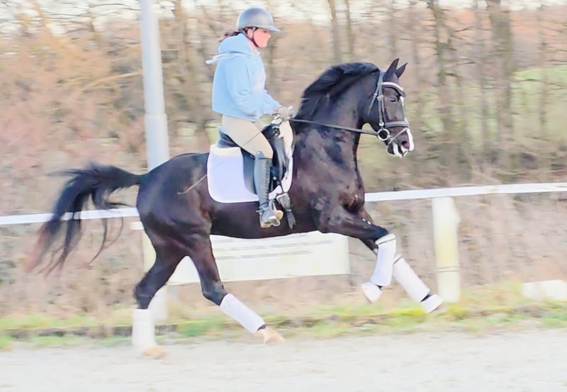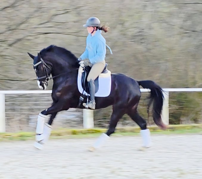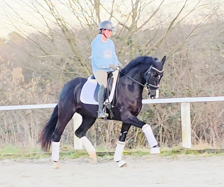 Die hübsche Bea stammt aus unserer eigenen Zucht! Bis zum Tag des Anreitens stand Bea ganzjährig drausen und konnte ihre Jugend in vollen Zügen genießen. Sie ist eine bildschöne Rappstute und bringt alles mit, was man für das große Viereck benötigt. Schon bei ihrem ersten öffentlichen Auftritt konnte sie direkt überzeugen und wurde 4. in einer Reitpferdeprüfung. Sowohl Verladen als auch der tägliche Umgang sowie putzen oder abspritzen meistert Bea problemlos. Ausgiebige Schmuseeinheiten geniest Bea auch sehr. Sie stammt aus einem hocherfolgreichen Mutterstamm. Die Mutter sowie weitere Geschwister stehen am Hof und können besichtigt werden. Bea verfügt über drei sehr gute GGA, angeritten, Röntgenbilder liegen vor, inkl Rücken und Hals, laut Tierarzt o.b.B. Sie hat einen kleinsten Chip, der laut Tierarzt keine Probleme machen sollte aber leicht zu entfernen wäre.