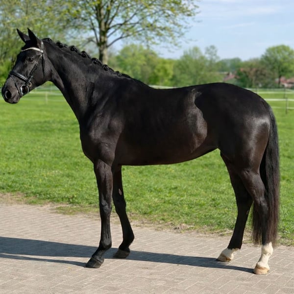 Diese elegante Rappstute (2023, ca. 167 cm) überzeugt mit moderner Ausstrahlung, viel Charme und einer hervorragenden Dressurabstammung. Sie wurde Ende letzten Jahres schonend angeritten und zeigt sich seitdem aufmerksam, lernwillig und stets arbeitsbereit. Dabei ist sie besonders menschenbezogen und lieb im täglichen Umgang – eine junge Dame, die gefallen möchte und mit positiver Einstellung an neue Aufgaben herangeht. Mit Taurus auf der Vaterseite bringt sie modernes Bewegungspotenzial mit, während Damon Hill mütterlicherseits für bewährte Rittigkeit, Qualität und Leistungsbereitschaft steht – beste Voraussetzungen für eine erfolgreiche Zukunft im Dressurviereck. Schmiede- und verladefromm, klar im Kopf und mit viel Entwicklungspotenzial – eine charmante Nachwuchsstute für ambitionierte Reiter. Gute Röntgenbilder vorhanden. 📍 Standort: Münster (NRW) Alles weitere gerne auf Anfrage