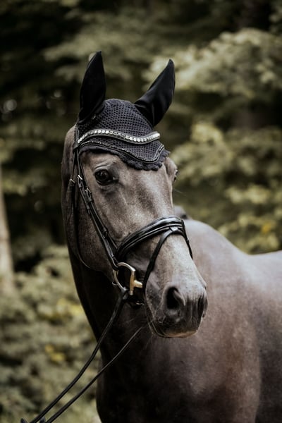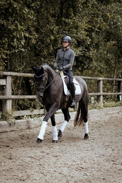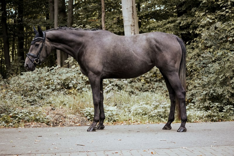 Deze prachtige, zeer donkere schimmelruin combineert alles wat je je voor het grote vierkant wenst: drie bovengemiddelde basisgangen, een heldere geest en een hart van goud. Haar stap is altijd ritmisch en duidelijk overtreedend. De draf heeft een mooie knieactie en is krachtig vanuit de achterhand, eveneens altijd in takt. Vooral haar galop verdient vermelding: altijd bergop en met veel ruimtegriff aangelegd. Dit paard is echt bijzonder. Voor haar drie jaar is ze een absolute voorbeeldleerling. Sinds mei dit jaar is ze in training en is heel voorzichtig, met veel liefde, opgeleid. Ik durf te zeggen dat ze moeiteloos elk longeercertificaat zou behalen. Ze wil haar ruiter altijd plezieren, reageert op de fijnste signalen, of dat nu stem of lichaamstaal is. Ze beschikt over uitstekende rij-eigenschappen en bevindt zich nog aan het begin van de opleiding op de schaal. Ze is absoluut onbevreesd en zorgt goed voor haar ruiter. Geen dag gaat voorbij zonder dat Lorena met een glimlach afstapt – gewoon een paard dat pure vrolijkheid brengt. Uit de stam van de moeder, een van de oudste westfaalse merriestammen (uit een gerenommeerd fokkerhuis), komen al vele sportpaarden die tot S-dressuur succesvol waren. De halfbroer (van Rock Forever) is 5 jaar oud en heeft plaatsingen in L-dressuur en heeft Dressuurpaard A gewonnen (video’s op aanvraag). De halfzus van Escolar (nu 6 jaar) was als veulen gekwalificeerd voor Lienen en toont nu onder het zadel eveneens hoge kwaliteit en altijd braaf – ze heeft al A-dressuren gewonnen met 8,7 en is op weg naar de L-dressuur. De halfzus van Zoom behaalde direct op haar tweede concours plaatsingen in de 4-jarige dressuurpaarden. Alle paarden waren tot nu toe vanaf het begin zeer braaf en wilden graag gefallen. De volle zus van de moeder is eveneens succesvol tot M** niveau. Burlington FRH was zelf enorm sportief en nauwelijks in de fokkerij actief, maar overtuigde door uitzonderlijke rij-eigenschappen, zenuwsterkte en bereidheid tot presteren. Ik verkoop deze merrie alleen aan de allerbeste en meest stimulerende handen. Ze is een echt hartpaard dat alleen maar plezier kan brengen. Röntgenfoto’s van januari zijn zonder bevindingen.