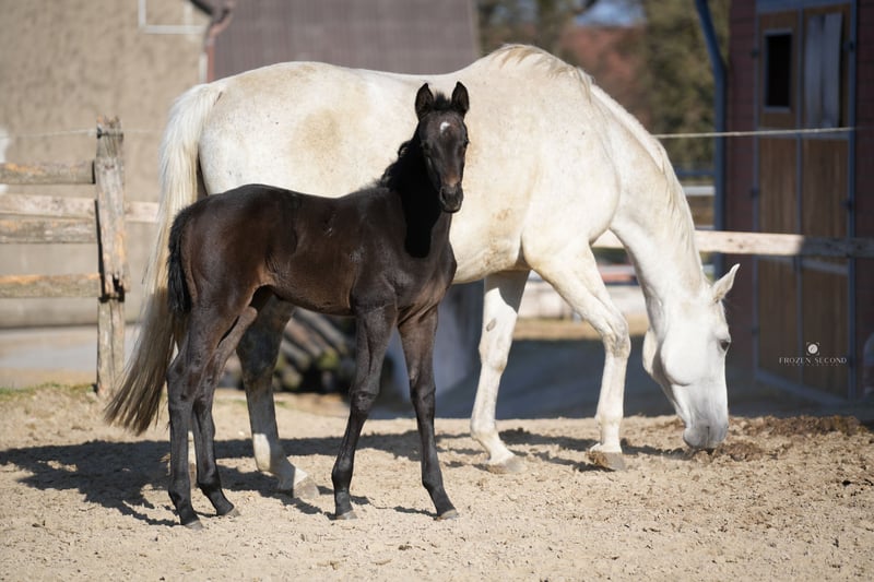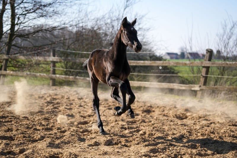 Gran potro con encanto y mucho potencial! Este chico guapo está equipado con todo lo que puedas desear de un gran caballo de doma. Tiene una increíble cantidad de espacio en su entrepierna y camina claramente, siempre está relajado y avanza. En el trote tiene mucho tacto, empuje desde los cuartos traseros y agarre espacial desde el hombro con la acción adecuada de la rodilla. El galope se lleva en los cuartos traseros y también está equipado en una fuerte tendencia cuesta arriba. En otras palabras, este potro tiene todo para el cuadrado grande y eso con una chaqueta permanente muy oscura. Desde la línea de la presa, que es una de las líneas de yeguas más antiguas de Westfalia (de la casa de un criador de renombre), ya ha habido una serie de caballos deportivos que han tenido éxito hasta el S. El medio hermano (de Rock Forever), también visto en las fotos, ha sido colocado cada caballo de doma L a la edad de 5 años y ha ganado caballos de doma A (enviar videos a pedido). Desde el principio, siempre se portó bien y fue sociable. La media hermana de Escolar (ahora de 4 años) fue calificada como potro para Lienen y ahora se muestra bajo la silla también con alta calidad y siempre bien educada. La hermana completa de la madre también es victoriosa hasta M**. Damsey FRH habla por sí mismo: nunca he visto un semental que todavía tenga tanto éxito en los deportes a una edad avanzada y que todavía se esté desarrollando mejor. Como cuestión de principio, solo tomo sementales que tienen éxito en el deporte para mantener la durabilidad y dureza en la cría. Estos sementales suelen estar equipados con una buena base, tienen voluntad de rendir y voluntad. Esto es lo que necesita nuestra cría. Solo vendo el potro en buenas manos: el video se hizo mientras corría libre, es el movimiento natural. Sin mucha "fanfarria".