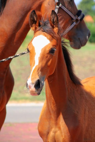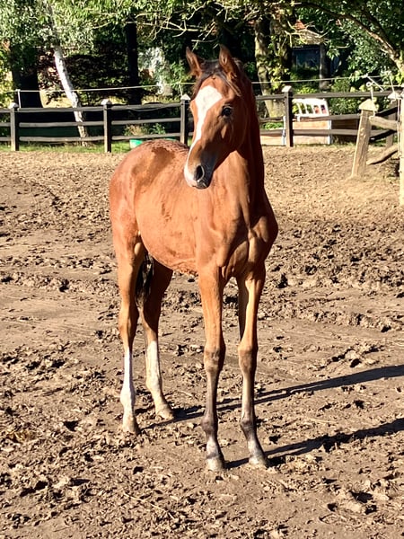 Dieses qualitätsvolle Stutfohlen aus dem ersten Jahrgang des FIRST DEAL besticht durch Korrektheit, Typ und Grundqualität. Auch in Sachen Charakter lässt dieses Fohlen keine Wünsche offen. Vater FIRST DEAL war gefeierter Prämienhengst bei den Oldenburger Hengsttagen und absolvierte seine Sportprüfungen beide mit Noten über 8,0. Er ist siegreich in Dressurpferdeprüfungen der Klasse A-M und wird nun schonend für größere Aufgaben vorbereitet. Muttervater Hancock war Trakehner - Siegerhengst und glänzte ebenfalls als strahlender HLP - Sieger mit der Endnote 8,78. Inzwischen weist er Erfolge bis zur Klasse S auf.