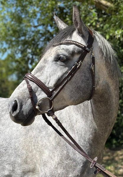 For sale is a modern, sportily built 4-year-old grey mare with striking jumping ability and very good rideability. She impresses with a light contact, works motivatedly, and shows herself to be willing and easy to ride in both dressage and show jumping. Already experienced at competitions, she has placed in Clear Rounds and has been presented in show jumping tests of class A*. Currently, she is trained up to A** and offers a lot of potential for a successful sporting future. The mare still brings her own ideas appropriate for her age and occasionally displays typical mare behavior – however, with some consistency and persuasion, she works well with her and is continuously developing. In handling, she is well-behaved, and is good for shoeing and loading. She has very good hooves and manages barefoot without any issues. An exciting young horse for ambitious riders! If you are interested or have any questions, we look forward to your message!