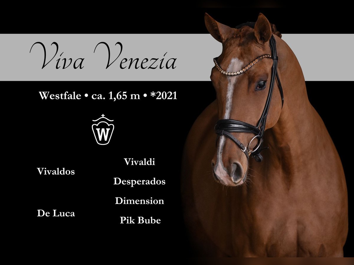 Liebe Interessenten, Für Terminvereinbarungen Probereiten senden Sie mir bitte eine WhatsApp. Für weitere Fragen bin ich tagsüber per WhatsApp erreichbar, telefonisch erreichen Sie mich am Besten zwischen 16 und 19 Uhr. Ich freue mich auf eine Kontaktaufnahme www.angelina-devittorio.de ⭐️Viva Venezia ⭐️ Alter: 5 Jahre (2021) Größe: ca 1,65 m Abstammung: Vivaldos x Dimension Ausbildungsstand: gut angeritten AKU: Gute Röntgenbilder vorhanden Zum Verkauf steht eine traumhaft schöne Fuchsstute, Tochter des Top-Vererbers Vivaldos. Sie verfügt über drei sehr gute Grundgangarten und ist gut angeritten. Noch wenig gefördert und ausgebildet möchte sie stets gefallen und alles richtig machen. Hier reift ein Juwel von besonderer Güte heran – ein hervorragendes Ausbildungspferd mit Perspektive für das Gehobene Dressur-Viereck. Hier wächst ein traumhaftes Nachwuchspferd mit großem Potenzial heran. Gute Röntgenbilder liegen bereits vor. Im Umgang ist sie super brav und unkompliziert, sehr verträglich und auch beim Reiten ausgesprochen kopfklar. Noch wenig geritten braucht sie noch entsprechende Grundausbildung (noch zu reiten wie ein 3 jähriges Pferd) daher wird sie weit unter Wert verkauft . Natürlich ist aufgrund ihres Ausbildungsstandes Erfahrung mit angerittenen Pferden Voraussetzung, dennoch absolut amateurtauglich. Sie zeigt keinerlei Unarten und bemüht sich stets, alles richtig zu machen. Aufgrund ihrer hervorragenden Abstammung auch hochinteressant für die Zucht. Ein hochveranlagtes Nachwuchspferd zu einem sehr interessanten Preis! ⚜️Tel: 0171-3438949 ⚜️a.devittorio@web.de ⚜️https://www.ehorses.de/angelinadevittorio Facebook und Instagram Angelina De Vittorio