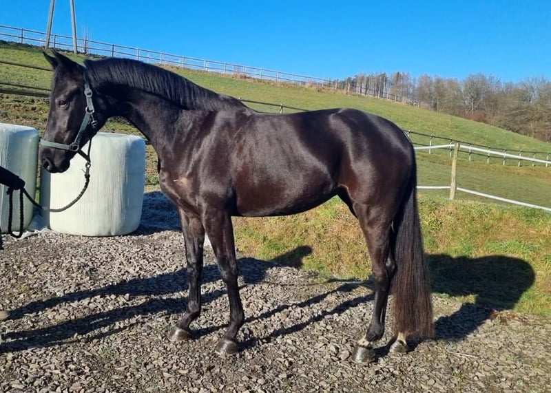 Estoy buscando un nuevo hogar para mi yegua Quintana, de 5 años. La compré como una promesa para el futuro, ya que actualmente solo tengo un pony y quería algo más joven y también un poco más grande. Sin embargo, he tenido que darme cuenta de que simplemente no somos compatibles (es mi primera yegua joven y necesita a alguien con más experiencia). Debido a su linaje, también puedo imaginarla muy bien en la cría. Ella ya sufrió una lesión, pero se ha recuperado completamente y no le afecta en nada. Se lleva muy bien con nuestro grupo de “retratados” (cuatro caballos castrados y dos yeguas). Además, está herrada y no muestra miedo a tractores, perros, etc. Quedo a disposición para cualquier consulta.