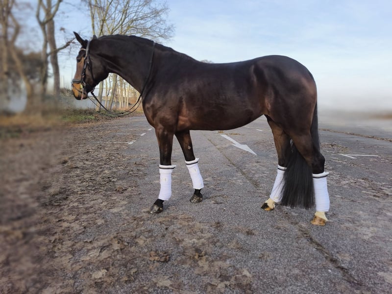 Elegant young dressage horse with spirit, presence, and three top-quality basic gaits. She naturally shows a lot of elasticity, is always active from behind, and offers a very comfortable ride. Her canter is naturally very easy to collect and always uphill. A small rough diamond that is ready to be further developed. She has only been ridden a few times so far but has already been out hacking at the walk, which she handled in a very exemplary manner. With some additional work and fine-tuning, this is a young prospect with no limits and suitable for higher-level work. Very sensible and well-mannered with people, calm in traffic, and not afraid of cars. Gets along well with other horses and is easy to load.