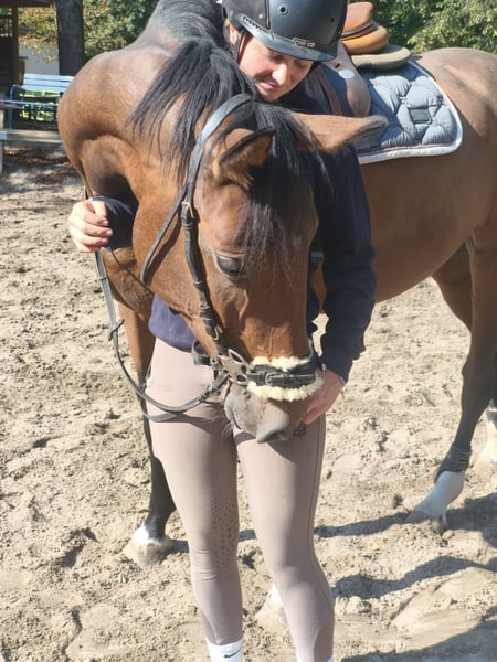 Cette jolie jument de 7 ans avec un extérieur attrayant cherche un foyer aimant et expérimenté. Malheureusement, elle n'a pas eu de belles expériences dans le passé et a donc besoin de personnes qui lui feront face avec calme, patience et beaucoup de cœur. Amanda a été délicatement débourrée chez nous et se montre sous la selle obéissante et coopérative. Elle se comporte bien en extérieur et peut être montée sans mors – que ce soit avec un licol à bascule ou un sidepull. Avec un mors, elle a encore des difficultés marquées, donc un cavalier empathique et expérimenté est nécessaire, qui lui donnera du temps et de la confiance. Ou alors, il vaut mieux la laisser tranquille à ce sujet. Sur le plan du caractère, c'est une petite souris très douce et câline qui recherche la proximité avec l'homme. Dans ses interactions, elle se montre généralement facile et sociable avec d'autres chevaux. Actuellement, elle est dans un box avec sortie quotidienne au paddock, mais elle se sentirait également bien dans un enclos à ciel ouvert. En raison d'une légère ataxie (shivering) et de ses mauvaises expériences passées, nous souhaitons la confier uniquement à des mains responsables comme cheval de loisir, où elle pourra trouver sa place sans pression. En raison de sa lignée, elle pourrait également être intéressante en tant que jument de reproduction. Nous recherchons pour elle des personnes qui ont à cœur de donner une chance équitable à un cheval avec un passé et qui ont la patience de construire progressivement la confiance ensemble. « Vous pouvez trouver encore plus de photos, vidéos et petits aperçus de la vie quotidienne de nos chevaux sur Instagram : [@maresi_lange]. N'hésitez pas à jeter un œil et à faire connaissance avec nos chevaux un peu avant. » La description du cheval repose sur des impressions et expériences subjectives de notre part et ne constitue pas un accord de qualité ni une garantie de caractéristiques. L'essai se fait à vos propres risques. Pour la présentation/l'essai du cheval, nous nous permettons de facturer une indemnité de 30 euros. Celle-ci sera bien entendu déduite en cas d'achat du cheval.