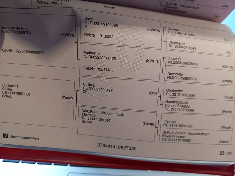 Wij bieden rechtstreeks uit onze fokkerij een karaktervolle en mooie zwartbruine merrie aan. Ze valt op door haar uitstraling en haar oprechte aard. Aangezien ze rechtstreeks van de fokker komt, geniet ze volledig vertrouwen in mensen en wacht ze nu op haar nieuwe ruiter. Wat haar onderscheidt: Uiterlijk: Een elegante zwartbruine dekhengst met een harmonieuze bouw en drie goede basisgangen. Afstamming: Zeer interessante genetiek uit For-Gold x Don Juan de Hus – een combinatie die rijvaardigheid en bereidheid tot presteren belooft. Karakter: Absoluut sympathiek, werkwillig en zeer aanhankelijk naar mensen toe. De merrie wil gestimuleerd worden en zoekt daarom een vertrouwenspersoon met paardenervaring en ruiterlijk gevoel. Ook een ambitieuze recreatie ruiter, die de nodige routine heeft om een jonge merrie veilig verder op te leiden, vindt in haar een trouwe partner voor hogere eisen. Deze merrie is een oprechte optie voor iemand die een paard zoekt om zelf verder te leren en samen te groeien.