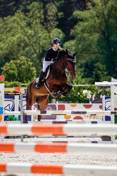 Madlen RUF 6-jährige Stute Vater: Nabab de Rêve Mutter von Aristo Z Saubere Röntgenaufnahmen auf Anfrage verfügbar. Geeignet für den Hochleistungssport, aktuell im Turniersport bei 125–130 cm (L, S) erfolgreich. Junge Pferde Meisterschaften (KMK): – 120 cm als Fünfjährige – platziert/ausgezeichnet – Als Sechsjährige nicht gestartet Preis ab 47.000 EUR Madlen RUF verfügt über ein sehr gutes Temperament, ist menschenbezogen, leicht zu handeln, mutig und einfach zu reiten. Sie macht fliegende Wechsel automatisch, ist freundlich zu Menschen und anderen Pferden und besitzt einen ausgeglichenen Charakter ohne Vorerkrankungen. Leicht zu transportieren (auch alleine) und gut beim Hufschmied. Sie kann den Reiter bei den Sprüngen unterstützen, reagiert sehr fein auf die Sitzhaltung, ist fleißig und bemüht, den Reiter zufriedenzustellen. Sie geht alleine ausreiten und ist zuverlässig. Sie wird nach einem 12/12-Trainingsplan gehalten. Ihre großzügigen, schönen Gänge, inklusive eines großen, bodenständigen Galopps, zeichnen sie aus. Diese Stute ist zu 100 % für den Spitzensport geeignet, aktuell im Training bei 140–150 cm, geritten von einer Frau. Größe: 173 cm.