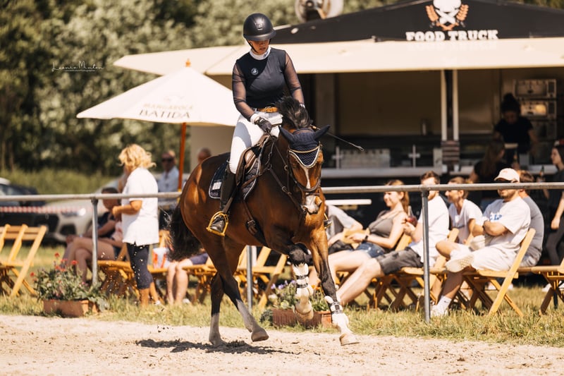For sale is a stunning and light-footed chestnut mare by Allegro Sun out of a dam with Polytrauma, due to her retirement from show jumping. The nearly nine-year-old mare stands approximately 16.1 hh and impresses with her exceptionally friendly nature and her willingness to perform in the arena. Louisa has achieved placements in A* and A** classes. She is well-behaved in the terrain and is familiar with trailers, transporters, and trucks. She was recently vetted, including a back check, with no findings. Since she has been in my possession, she has never been ill, lame, or experienced any health issues. Currently, she is kept in box stalls with daily turnout on pasture or paddock. A fee of €30 will be charged for pre-ride/test riding, which will be credited towards the purchase price.