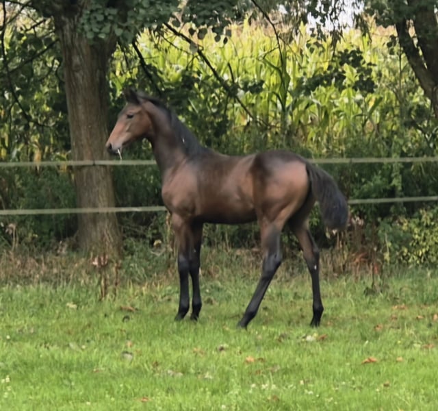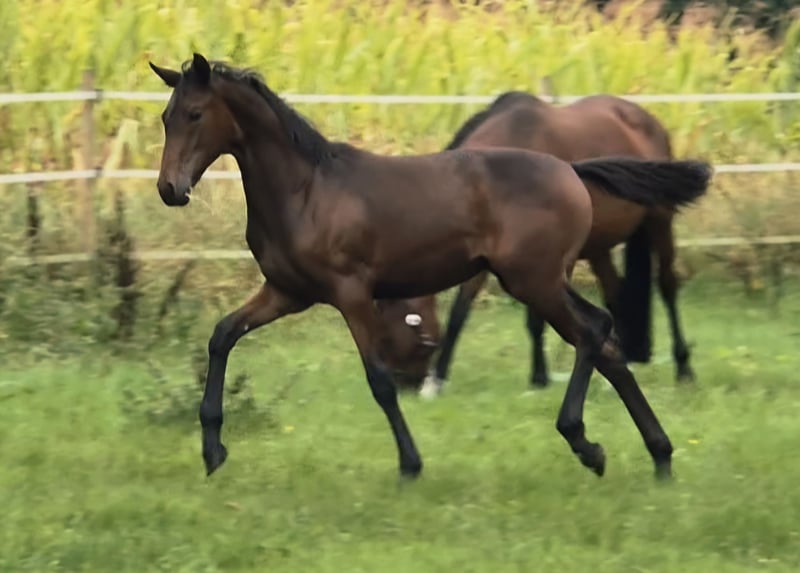 Beautiful filly born in April 2025, tall and very well-behaved. She is growing up in a herd environment. She has wonderful, powerful gaits with good stability. Classically colored, completely dark brown without any markings. The foal is familiar with the basics, including haltering, leading, grooming, deworming, and hoof care. We run a loving small private breeding operation, and this year we would like to offer this amazing filly. Currently, there are no additional videos available. The foal can be viewed in person almost daily. If you have any further questions, please feel free to contact us.