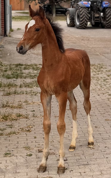 Wij verkopen ons merrieveulen van 21-06-2025 Dit mooie veulen is afstammend van Comme il faut, een van de beste springhengsten aller tijden. Aan moederszijde draagt ze het legendarische bloed van For Pleasure. Een echte parel voor fokkerij en sport. Ons veulen groeit op in een diervriendelijke omgeving - ze is dag en nacht buiten in een gemengde kudde, uitstekend gesocialiseerd en al nu voorzien van veel uitstraling, een correct fundament en elastische bewegingen. Het veulen kan voor verdere opfok bij ons blijven. Tel.: +49 15175066343