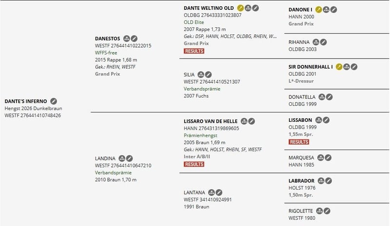 Nach dem Absetzen darf der kleine Dante ausziehen. Jungpferdeerfahrung setzen wir ebenso voraus, wie eine artgerechte Haltung mit Altersgenossen. Dante zeigt sich jetzt schon von seiner besten Seite. Er verfügt über schöne und schwungvolle Gänge, ist aufgeweckt, sucht immer den Kontakt und freut sich über jeden Besuch. Halfter und Strick sind ihm ebenso bereits bekannt, wie putzen und Hufe geben. Seine Abstammung spricht wohl für sich. Der äußerst typvolle Dante Weltino-Sohn DANESTOS - in lackschwarzer Aufmachung - begeistert mit Präsenz und überragendem Potential. Den 50-Tage-Test in Schlieckau absolvierte er souverän mit 8ter Noten und qualifizierte sich 2020 für das Bundeschampionat. Unter seinem Reiter Manuel Springhetti ist DANESTOS mittlerweile in der schweren Klasse angekommen, platzierte sich mehrfach hoch in Dressurprüfungen der Klasse S sowie in der Qualifikation zum Nürnberger Burgpokal 2023 und 2024. Bei den Österreichischen Meisterschaften 2023 in Kärnten sicherte sich das Paar den Bronze-Rang in der Kleinen Tour. In der Saison 2024 war DANESTOS siegreich bis Intermédiaire I und kann aktuell erste Erfolge auf Grand Prix-Niveau feiern. Sein Vater ist der international für Schweden erfolgreiche Dante Weltino. Über ihn sowie über seine Mutter, die Verbandsprämienstute Silia von Sir Donnerhall, ist DANESTOS gleich dreimal auf Donnerhall I gezogen. Sir Donnerhall war erfolgreicher Bundeschampionatsteilnehmer und seine Nachkommen sind seit Jahren hocherfolgreich im Dressursport. Silia ist Halbschwester zum S-Dressurpferd Salierie und zu dem Landbeschäler SUNDAY von Sandro Hit. Er ist mit Anja Wilimzig hoch platziert bei Bundeschampionaten, der Weltmeisterschaft der jungen Dressurpferde und in Grand Prix Prüfungen. Landina brachte stets qualitätsvolle, gesunde und vor allem charakterfeste Fohlen zur Welt. Die Stute ist ebenso ein Traum, wie der Vater Danestos. Sie ist eine Tochter des dreifachen Bundeschampions Lissaro van de Helle. Ihre Abstammung führt über Labrador, Ramiro Z und Paradox, zurück auf den renommierten westfälischen Stamm der Flutwelle von Sielhorst. Dieser Stamm brachte bekanntlich über 20 gekörte Hengste, darunter Sandro Boy Junior, Primeur´s Ass und Festival, sowie einige Siegerstuten in Münster Handorf hervor. Landinas bisherigen Nachkommen zeigen sich bis dato vielversprechend in Dressurprüfungen, bis zur Klasse L.