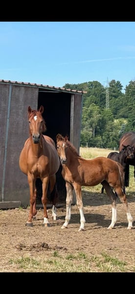 Schicke Stute von Baron wegen Aufgabe der Zucht zu verkaufen. Die Stute war Zuchtstute und hat bereits zwei hochbewertete Hengstfohlen von Santiamo GT und Vital Hit ( Fohlen auf dem Bild) Die Stute hat drei sehr gute GGA und ist brav im Umgang.
