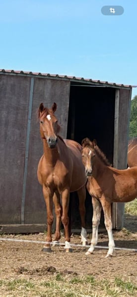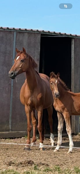 Te koop aangeboden: mooie merrie van Baron vanwege het stoppen met de fokkerij. De merrie was een fokmerrie en heeft al twee hooggewaardeerde hengstveulens gekregen van Santiamo GT en Vital Hit (veulen op de foto). De merrie beschikt over drie uitstekende gangen en is goed te hanteren.