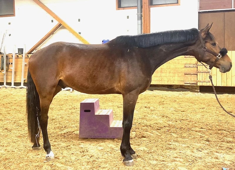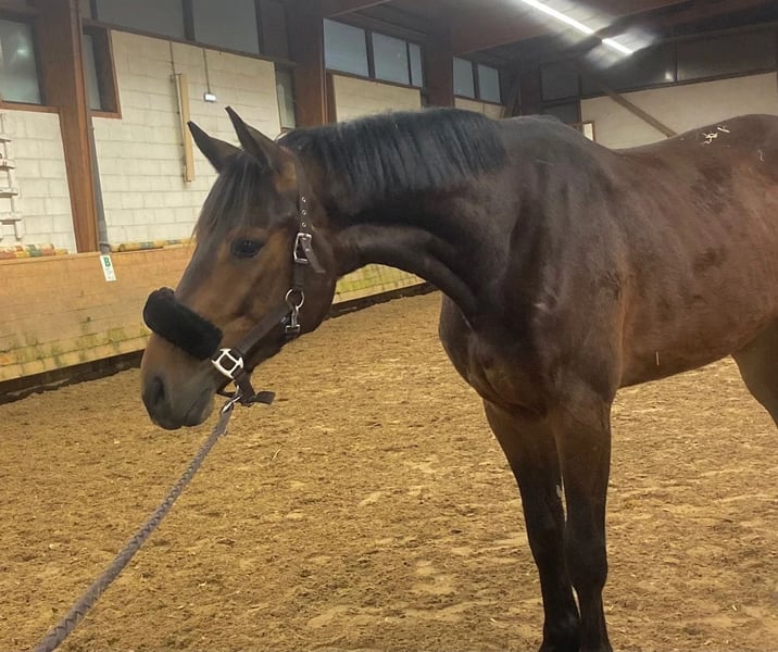 Chic 4-year-old bay gelding, standing 1.70 m, sired by a son of Comme il faut (Cornet Obolensky) out of Heartbreaker, and out of Kavinia (Numero Uno), one of the best KWPN jumping lines. He has recently been backed: trained in all three gaits and jumping under saddle. Very willing and suitable for amateurs, he has an innate sense for the jump, is built for it, and has a very good back passage! Minimum potential of 135 cm in the future. Flexible, stylish, balanced, and very elegant, with exceptional gaits! He is currently ridden outdoors (accompanied for now) and is not fazed by anything.