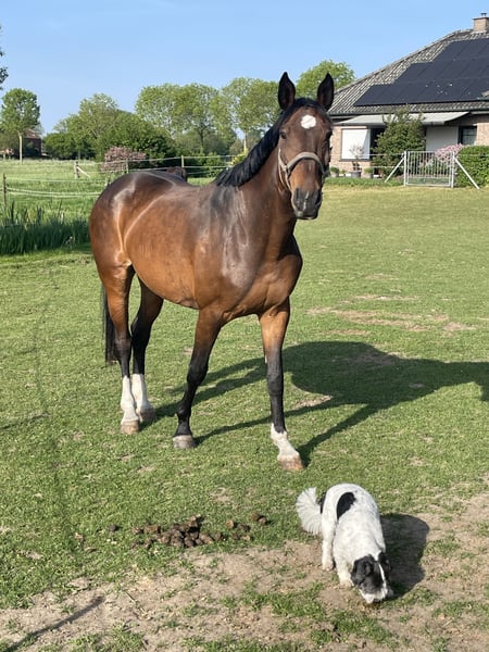 Stute sucht seinen Menschen Rose ist eine 11 Jahre alte, 165cm große braune Stute. Gezogen Rascin/ RamiroZ x Graf Top/ Contender. Rose ist eine liebe Menschenbezogene Stute. Sie ist seit einem Jahr in meinem Besitz, beißen sowie ausschlagen kennt sie nicht. Sie verfügt über drei gute GGA, die man im Trab sowohl im Galopp sehr bequem sitzen kann. Leider muss ich mir eingestehen, das wir reiterlich nicht zusammenpassen. Da Rose sensibel ist braucht sie eine sichere Hand die sie führt. Dies kann ich ihr zeitlich und reiterlich nicht bieten. Rose braucht ein klares strukturiertes Umfeld und regelmäßige Bewegung… mit langen Pausen kann sie nicht. Rose ist kein Anfängerpferd. Aufgrund ihrer Abstammung, könnte ich sie mir auch als Zuchtstute vorstellen. Leider hat Rose jetzt seit 4 Monaten gestanden und mir fehlt gerade die Zeit sie wieder anzuschieben( wegen eines ReHa Aufenthaltes meines Sohnes ), somit wird ein vorreiten bzw, ausprobieren schwierig. Es gibt aber ein Video wo sie geritten wird. Sie ist gesund und wartet darauf wieder zu starten und ihrem neuen Reiter zeigen kann was sie wirklich kann. Rose ist in der Herde verträglich, kennt Boxenhaltung, sowie Offenstall. Sie geht auf den Anhänger und ist beim Schmied brav.