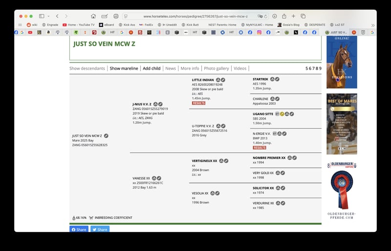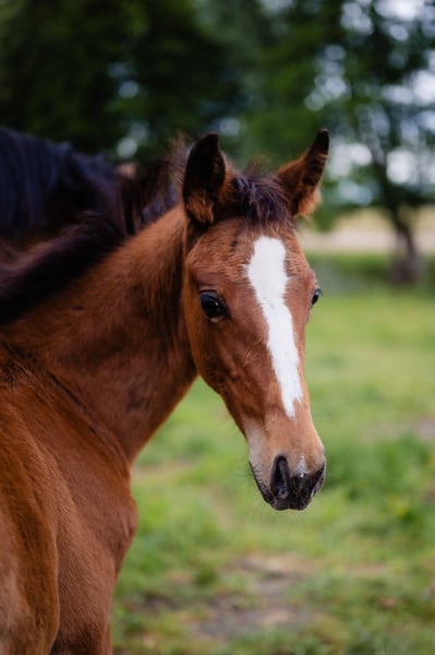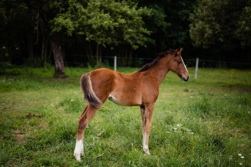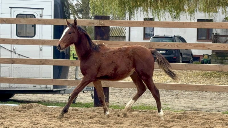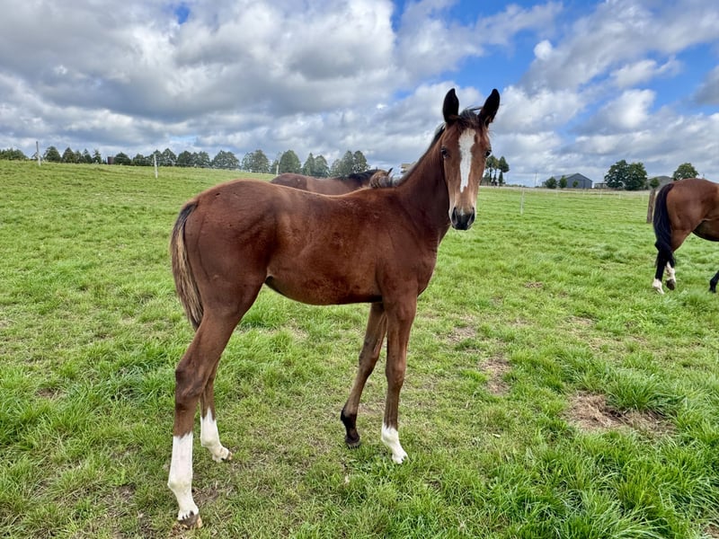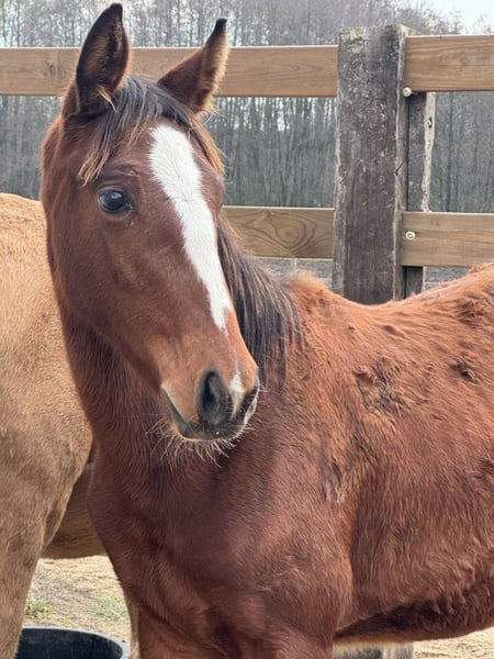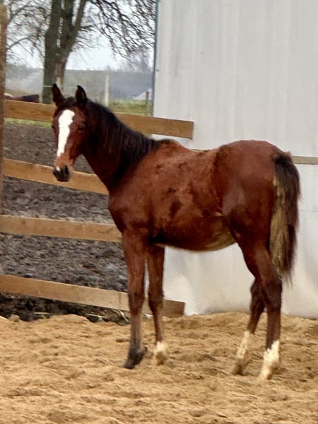 A great bay filly, JUST SO VEIN MCW Z, born in March 2025 is looking for a new home. She is after J-Nius VV Z (Little Indian x Ugano Sitte) from Vanesse XX, a Tb mare. Her sire does not need any introduction, a very popular young and very talented jumping stallion. Her mother earned more than 90K in racing, finishing her carrier at 10 yo in a great health. This filly is her first baby. The filly is very nice, 70% TB, so great for jumping or eventing career.