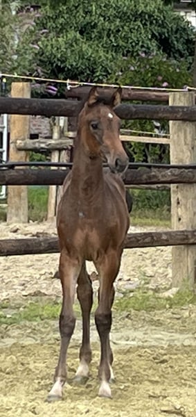 Erst am 21.06.25 geboren ist Corali ein auf gutem Fundament stehende junge Stute. Mit einem Hintern wie ein Quaterhorse ausgestattet wird es ihr an Kraft nicht fehlen. Ihr Vater Cote d‘Or Z selber erfolgreich über 1,55m gesprungen geht es weiter mit Carambole und Diamond’s Billy beide über 1,60m usw. Mütterlich benötigt es auch nicht viel zu sagen: Diarado und Carthago, sowie die Oma Pur Lady selber haben ein Zeichen im Springsport gesetzt. Hier wächst eine hübsche und vielversprechende Stute heran.